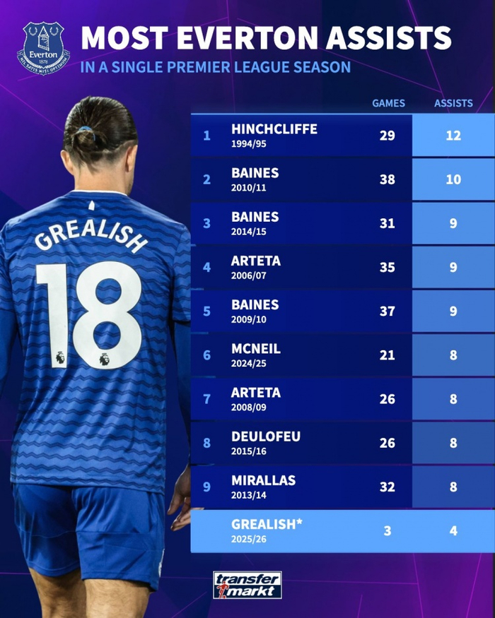 直播吧9月12日讯 英格兰中场格拉利什今夏转会埃弗顿,重新找回了状态。凭借新赛季三次出场就贡献的四次助攻,格拉利什有望打破埃弗顿单赛季英超联赛中的助攻纪录,该纪录由安迪-辛奇克利夫保持。